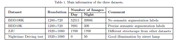 本文首先介绍了BDD数据集(BDD100K和BDD10K),ZJU数据集和Nighttime Driving test数据集。他们的图像分辨率,白天以及夜晚图像数量,标注信息如Table1所示: