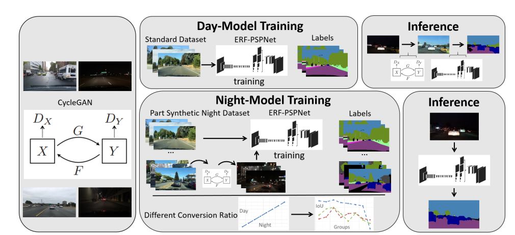 在我们的工作中提出了两种方法来缩小语义分割中白天和夜间图像之间的差距。这两种方法分别为将白天域图像转换为夜间域图像和夜间域图像转换为白天域图像。Figure1展示了我们的框架。我们训练一个CycleGAN来执行跨域转换。在第一种方法中,我们将夜间图像转换为白天图像,然后在白天图像上训练ERF-PSPNet。在第二种方法中,CycleGAN将训练集的部分白天图像转换为夜间图像,以扩展数据集的域覆盖范围。最后,我们用调整后的具有一定百分比的夜间图像的训练数据训练ERF-PSPNet,达到提高夜间语义分割模型性能的目的。