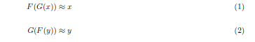 CycleGAN是一种在没有配对示例的情况下学习将图像从原域转换为目标域的方法,这符合我们的需求。CycleGAN包含两组GAN,每一组GAN又包含一个生成器和鉴别器。生成器和鉴别器进行图像风格转换,将图像从域X转换到域Y或者从域Y转换到域X。F和G代表了两个GAN,他们生成的内容分别为当前域图像的对立域图像。我们同时训练了G和F,并增加了循环一致性约束: