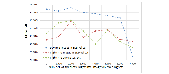 我们可以看到使用2000张合成的夜间图像的训练集得到的效果是最好的。然后在5000的时候曲线达到另外一个峰值,这个原因可能是5000是2000的对称数(总数是7000),并且该模型以互补的方式从白天图像中学习纹理信息,从夜晚图像中学习光照信息,但是此时白天的性能已经降低到了一个较低的水平。当所有图像均为夜间图像时,IOU甚至低于30%,这是因为合成图像中的纹理不等同于真实图像中的纹理。综上所述,使用2000张合成的夜间图像和5000张真实白天图像的训练集得到的效果是最好的。