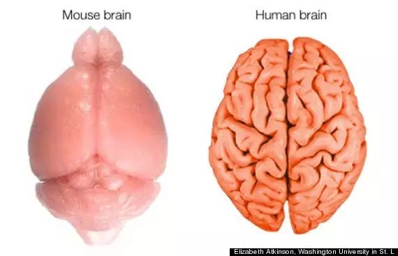 ►鼠脑光滑,人脑充满了沟回的结构。图片来源:huffingtonpost.com