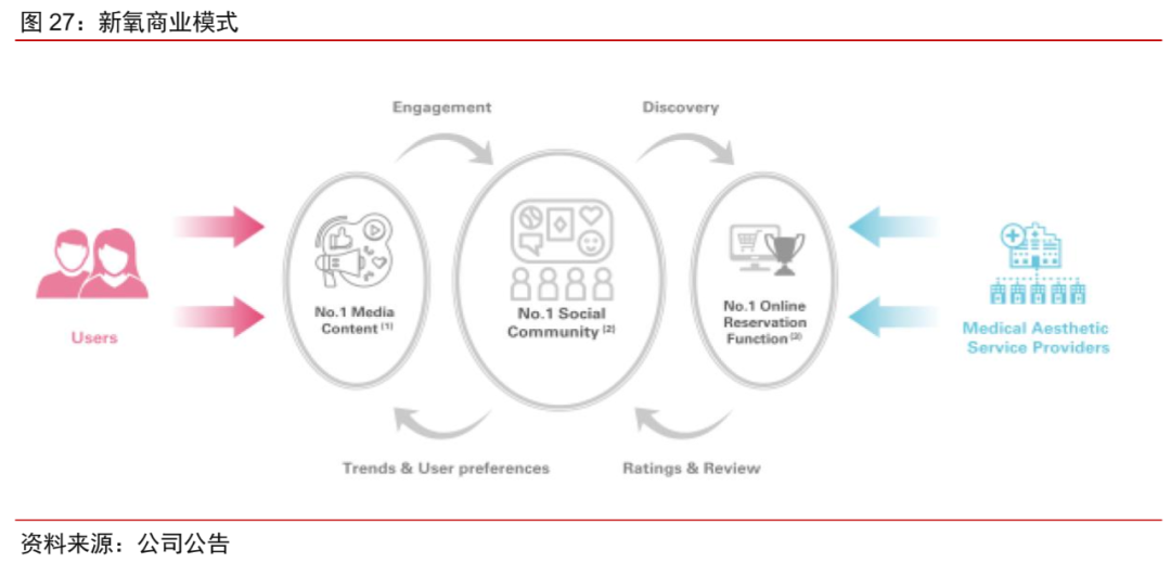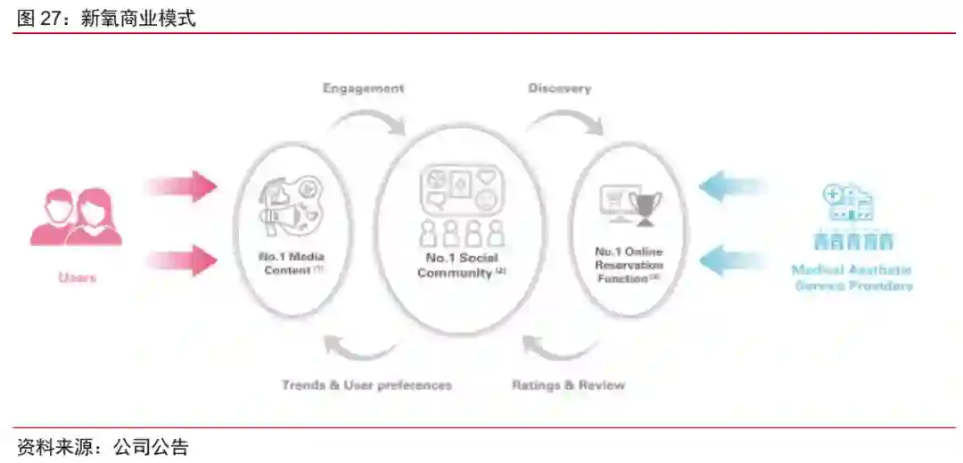 具体而言,通过内容创作、社群参与以及线上预订的商业模式吸引用户和医美机构,连接供需两端,降低信息不对称,在提升用户粘性和消费者决策效率的同时,最大限度地撮合消费者和医美机构之间的交易。