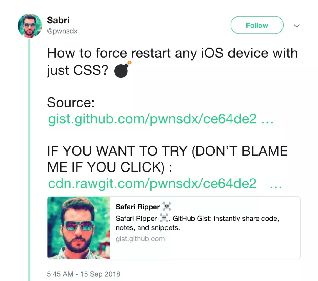 Sabri Haddouche 在 GitHub 上发布了一个示例网页,只有 15 行代码,如果在 iPhone 或 iPad 上访问这个页面,就会崩溃并重启。在 macOS 上使用 Safari 打开该页面也会出现浏览器挂起,无法动弹。