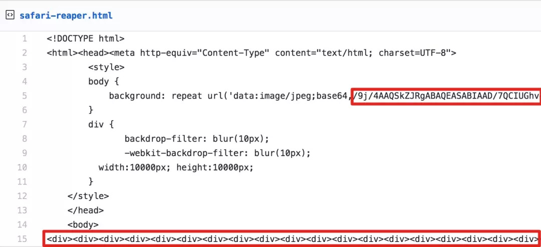 上面红色部分是一张经过 base64 编码的图片,下面是很多<div>标签。正如 Haddouche 所说,就是利用了在过滤器属性中嵌入大量 HTML 元素标签来消耗设备的资源,从而达到攻击的目的。