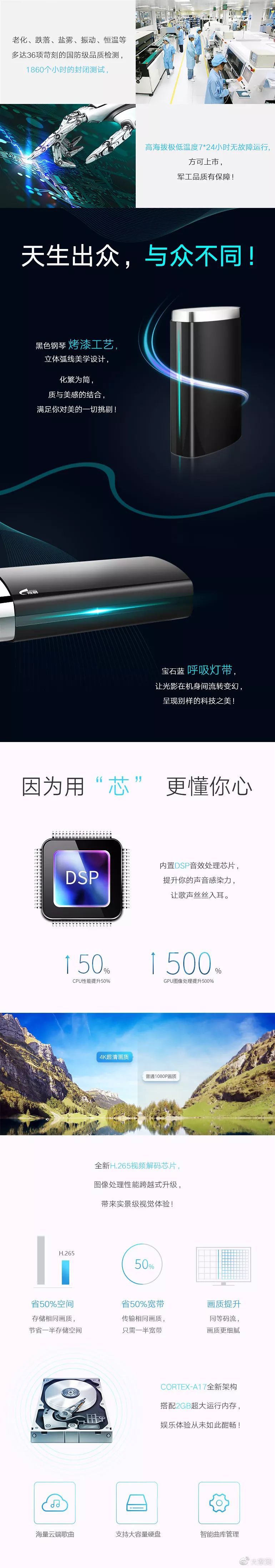 3、它也是4K超清播放器:优选顶级芯片,采用全新硬件架构,4K超高清解码技术、5.1声道环绕;2G内存,8G闪存,核心CPU性能、GPU图像处理性能全面提升,拥有更流畅的点播体验。
