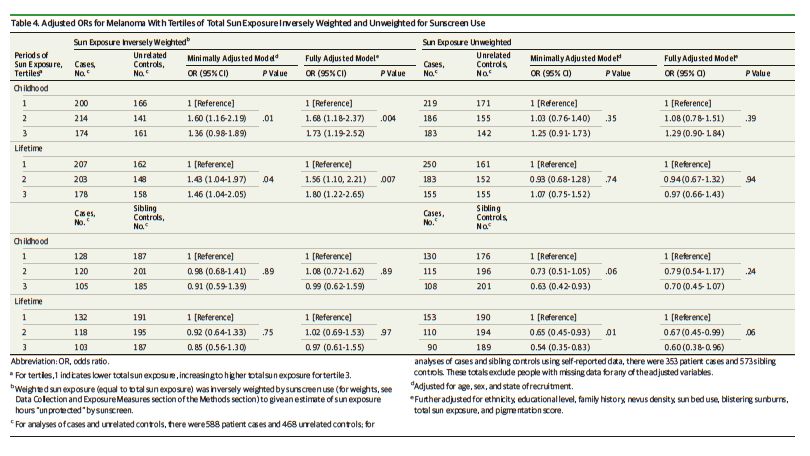 表2. 儿童和一生中防晒霜的使用和黑色素瘤发病风险的关系