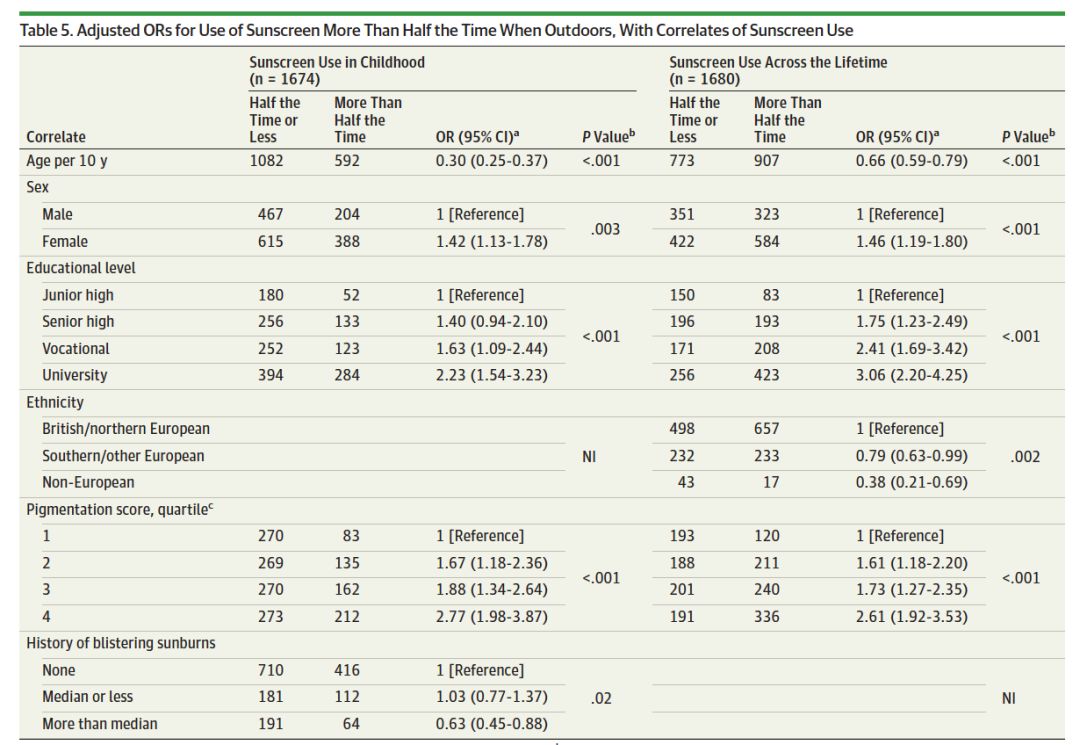 影响防晒霜使用的因素:儿童时期规律使用防晒霜的人群(即外出时超过1半时间使用)多见于女性,年轻,高学历,皮肤色素沉着较浅和有较严重的晒伤史,见下表5.