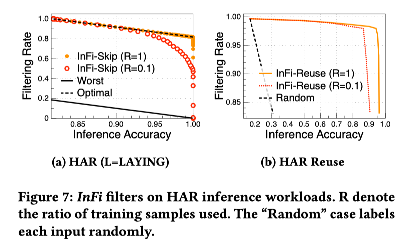 InFi 的训练成本也很低。在一个基于运动信号的动作识别应用中,仅使用 10% 的训练数据集即可得到过滤表现接近最优的 SKIP 和 REUSE 结果。InFi 可在保持超过 95% 推理精度的情况下,节省 80% 的推理运算。