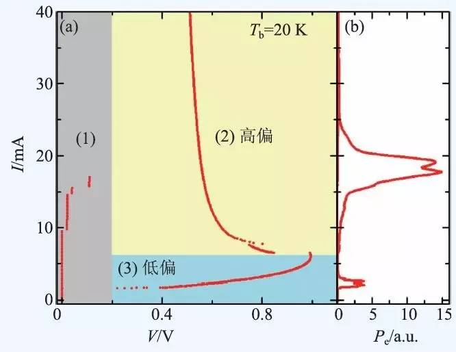 高偏区域则如图5(a)中的黄色区域(2)所示。器件处于该区域时所有的本征约瑟夫森结都处于电压态,且随着偏置电流增大,器件电压逐渐减小。同时器件上的温度分布极端不均匀,局部最高温度可高于BSCCO 单晶的临界转变温度。当器件的几何谐振腔振荡模式的频率与约瑟夫森频率一致时,就可能产生太赫兹辐射。图中所示的辐射源器件在高偏具有辐射,出现的偏置范围为10—25 mA。