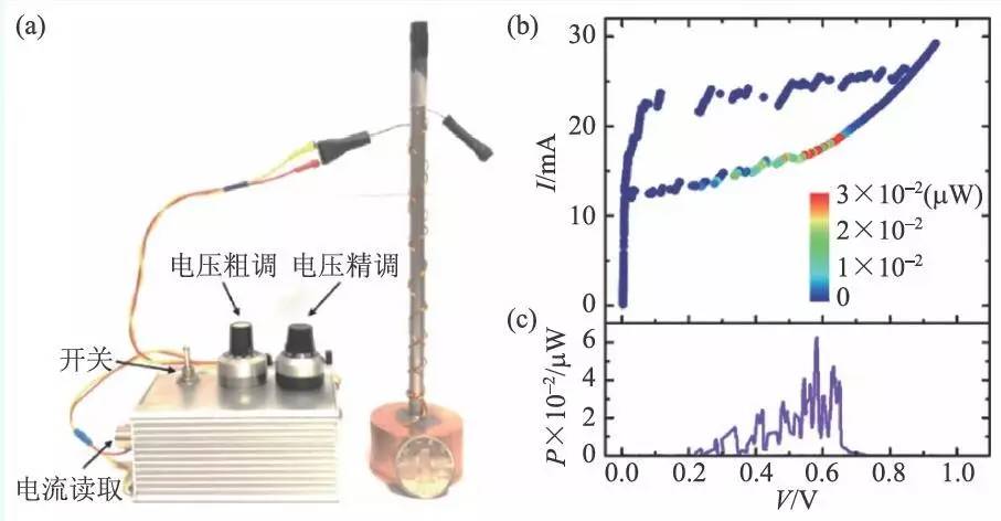 采用三明治结构改善导热后,进一步扩展了器件的工作温度范围,工作温度上限可至77 K以上的液氮温区。基于此,我们研发了一套液氮冷却、具有温度调节功能的便携式小型高温超导太赫兹辐射源装置,如图12 所示。该装置体积不足40 cm3,最大辐射功率1.17 μW,最大可调谐带宽100 GHz。该装置还可用一节1.5 V 干电池和偏置调节模块代替复杂的电流源系统,使其能够像“手电筒”一样便于使用,初步实现了太赫兹源的小型化、实用化和低成本化,为促进高温超导太赫兹技术的实际应用起到了推动作用。