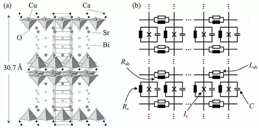 图1 (a)Bi2Sr2CaCu2O8单晶的晶体结构图;(b)串联的本征约瑟夫森结阵的等效电路