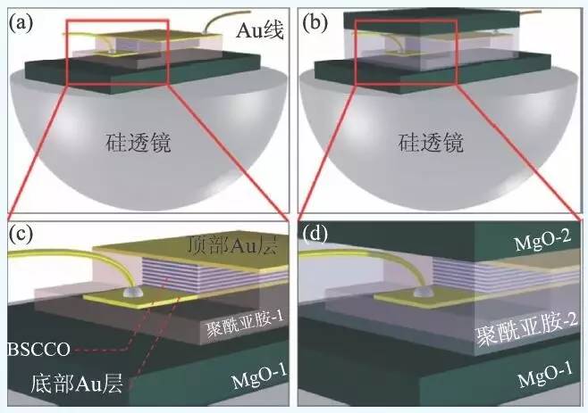 高温超导太赫兹辐射源的辐射频率与器件电压有关,但实际背后本质的影响因素却是器件的冷却与散热性能,这一性能会决定太赫兹辐射源能达到的最高器件电压,从而影响辐射频率。辐射源器件的热表现与器件衬底的材料、BSCCO单晶与衬底之间的接触、BSCCO单晶散热的途径等诸多因素有关。2014 年,我们研究团队在BSCCO 单晶散热途径上取得突破,在gold—BSCCO—gold 结构高温超导太赫兹辐射源器件上叠加了第二块衬底而形成了三明治结构,极大地改善了器件的整体导热性能,如图11 所示。增加另一块衬底意味着增加了一条散热途径,使得相同浴温和电流偏置情况下,BSCCO单晶的温度更低,从而辐射出频率更高的太赫兹波。在此之前,超导太赫兹辐射源的最高频率大约为900 GHz,而采用三明治结构改善器件导热后,辐射频率突破了1 THz。
