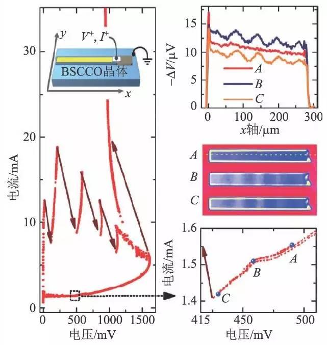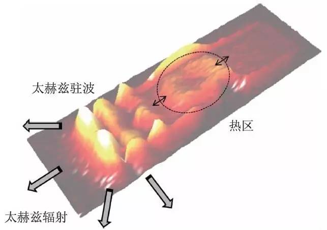 自2007 年开始陆续有关于用高温超导BSCCO单晶制备太赫兹辐射源的报道,该种太赫兹辐射源具有辐射功率可观、辐射频段适中(300 GHz—2.4 THz)、辐射频率连续可调等若干独特的太赫兹辐射性质。同时高温超导BSCCO太赫兹辐射源器件工作时,其内部还存在太赫兹驻波、热区等新奇的器件物理现象,如图4 所示,值得深入研究。