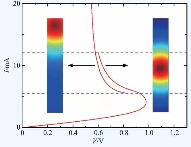 某些情况下,随着偏置电流的连续变化,热区的变化并不连续,对应在伏安特性曲线上则是电压跳变,而在低温扫描激光显微镜的二维成像上则是热区位置跳变。这一物理现象与给定外界条件下一个物理系统存在多个稳态有关。图8 所示的仿真结果中,在5.5 mA至12 mA之间的偏置电流区域,同一偏置电流就存在两个稳定的电压态。