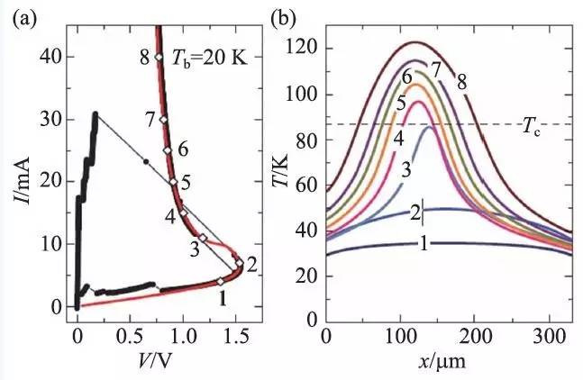 首先是存在热区。长方体形有源区的温度分布主要集中在长边(通常定义为x 轴)上,在高和窄边上基本不变,因而一般以x 轴上的温度分布来表征器件的温度分布情况。当偏置电流进入高偏区域时,器件上温度分布出现不均匀。此处可比较图6(a)中偏置点2 和偏置点3,其温度分布如图6(b)所示,偏置点2 的温度分布均匀,而偏置点3 的温度分布明显不均匀,且最高温度接近临界转变温度。一般随着偏置电流增加,热区温度极值将超过Tc ,图中偏置点4 的温度极值已经超过Tc 。随着偏置电流的变化,温度极值出现的坐标可能会连续移动,热区的面积会逐渐扩大。