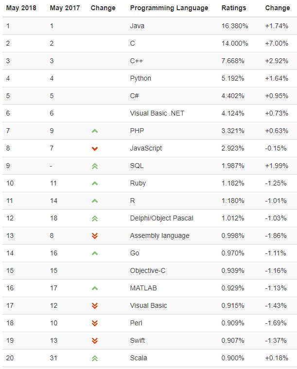 除 Scala 之外,我们还看到 C 语言本月迎来了 7% 的最高涨幅。回顾前几个月的榜单,不难发现 C 语言今年一直处于快速增涨状态。TIOBE 没有给出其增涨原因,但在 C 语言拿下 2017 年度编程语言时,就已经有许多人认为是与物联网的复苏有关。