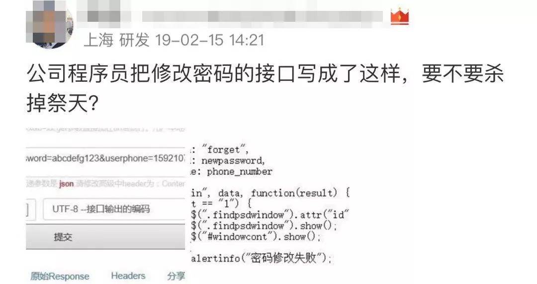 相信大家身边都有代码不规范的,最近就有网友在某论坛上吐槽看到程序员写的一个修改密码的接口,心想要不要把它杀了祭天