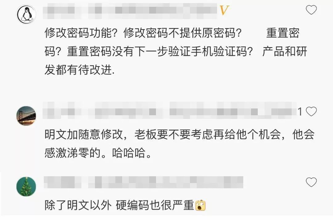 该代码也引起了围观网友的讨论与热议。基本上每个网友都看出了这个接口的问题所在,明文加随意修改密码。