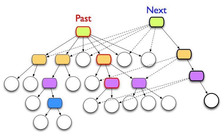 在这里,数据保存在叶子节点上,然后以数据的索引为基础构建出来一棵树。当整个结构的某些数据变更时,我们只需要产生新的数据,然后产生索引该数据和未改变数据的一棵新的树,从而在空间上避免 immutable 产生的拷贝。在函数式编程语言中,旧的树如果没有人用了,GC 就回将其回收,但如果我们把每个 event 产生出来的新的树和旧的树链接起来,或者记录下来,就具备了时间旅行的能力。