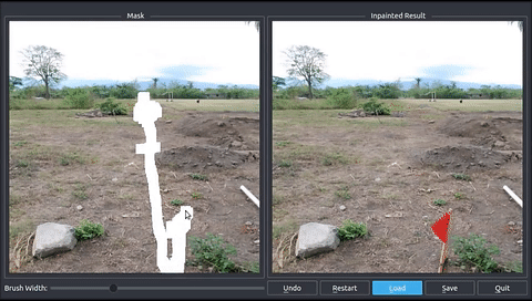 Image Inpainting除了能修复受损的图像,还能去掉图像中的某些物品,比如把草地中的石头涂抹一下,恢复的后图片中不再有石头。