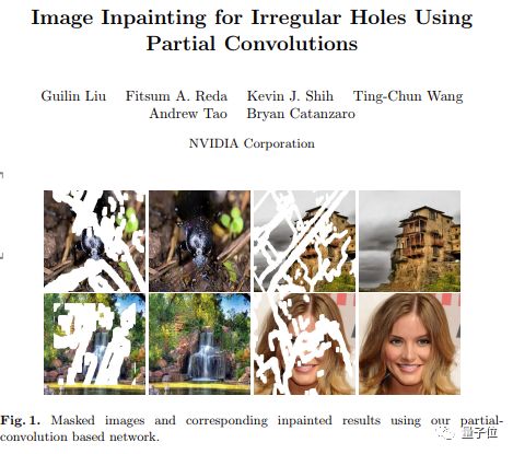 即上面提到的文章,这是来自英伟达Guilin Liu等人的团队在2018年发表的研究。当画面被严重涂抹后,模型仍然能够恢复出“原来”的图像,可以说是“毫无PS痕迹”。