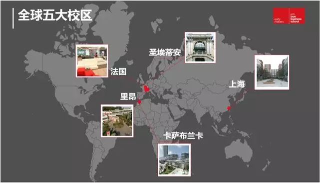 法国里昂商学院已实现全球布局,在欧洲的巴黎、里昂、圣埃蒂安、亚洲的上海、非州的卡萨布兰卡均设立了校区