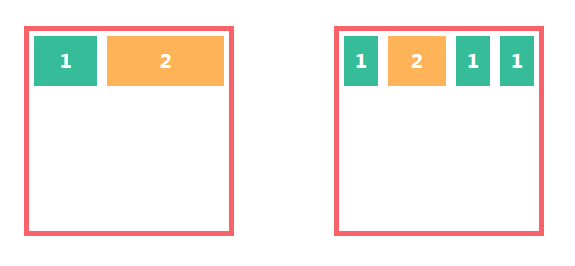 这里还有一点,就是新旧语法的算法是不一样的,假设 box-flex 的值不等于0,旧语法中,如果有多余的空间,box-flex 的值越大,说明空白部分的占比越多,反之亦然: