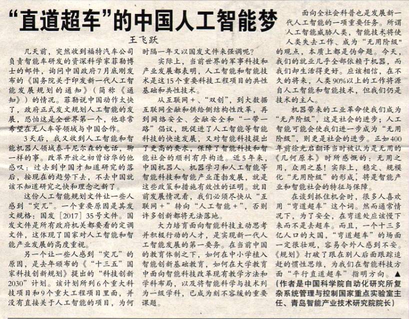 编者按:国务院近日印发《新一代人工智能发展规划》,提出了面向2030年我国新一代人工智能发展的指导思想、战略目标、重点任务和保障措施。本文是中科院自动化所王飞跃教授对《规划》的印发所作的深刻理解与思考。