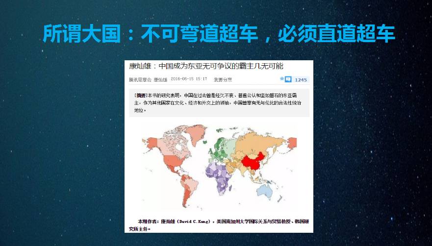 近年来,许多人都喜欢谈抓住机会“弯道超车”。然而在多数普通人心里,为了安全,大家应在弯道之处慢下来,不应为了领先竞争而超车。因此,客观上“弯道超车”的讲法加剧了“中国威胁论”的市场。毕竟我们是十三多亿人口的大国,如此大国弯道超车的场面一定十分壮观,但太容易令外人不安。《新一代人工智能发展规划》打破跟在别人后面跟踪追赶的惯性思维,为我们在智能科技方面“平行直道超车”指明了方向。有了世界上这第一份人工智能的囯家发展规划,就有了我们发展自己智能科技的直道。希望我们能够直道超车,领先世界的智能科技与智能产业,以中国的智能梦实现我们的中国梦。