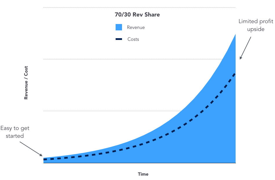 收入分成使得进入市场更容易,但平台方难以利用规模效应,收入增长被成本增长拖了后腿