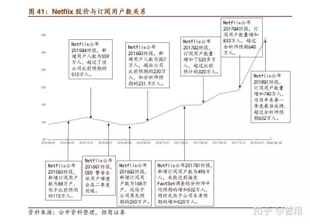 过去三年,几乎每季度的 Netflix 订阅用户量变化情况都会牵动大小股东的心,你会发现,市场真实情绪和未来预期都通过这个数据实时反馈到股价上。