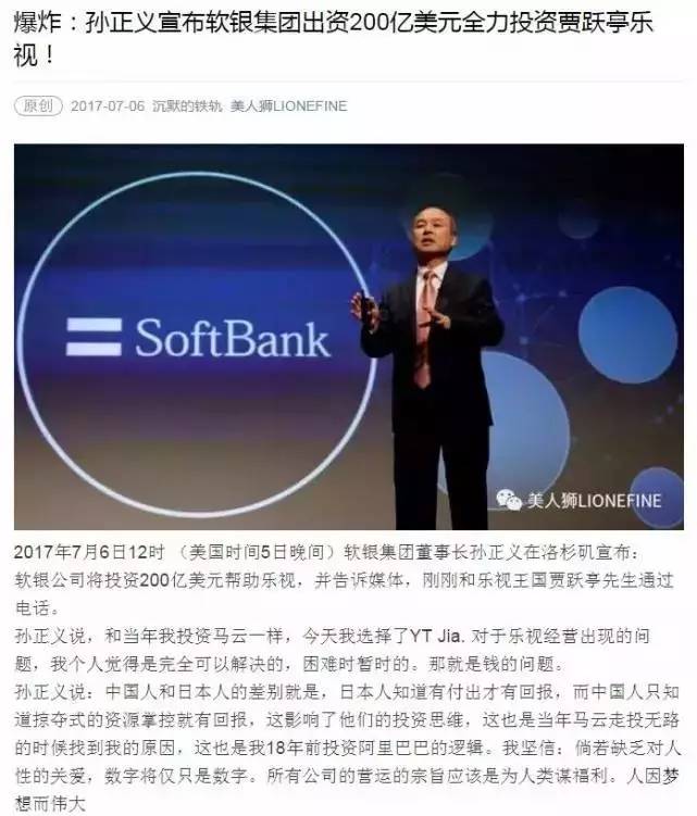 文中称,2017年7月6日12时(美国时间5日晚间)软银集团董事长孙正义在洛杉矶宣布:软银公司将投资200亿美元帮助乐视,并告诉媒体,刚刚和乐视王国贾跃亭先生通过电话。”