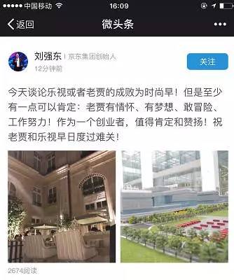 刘强东在社交媒体发消息称“老贾有情怀、有梦想、敢冒险、工作努力!作为一个创业者,值得肯定赞扬!祝老贾和乐视早日度过难关!”