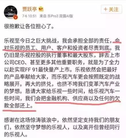 贾跃亭午间发公开信:我会尽责到底,把欠款全部还上。