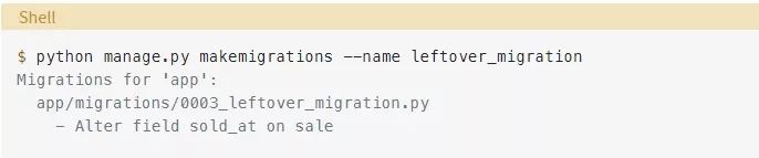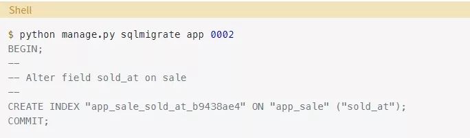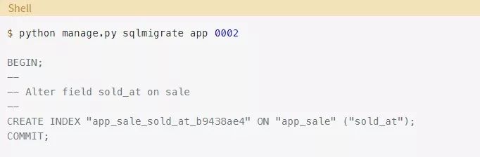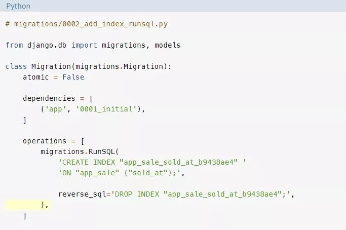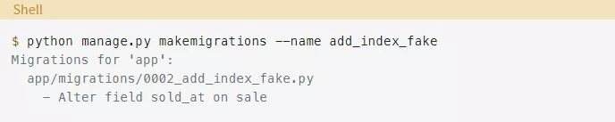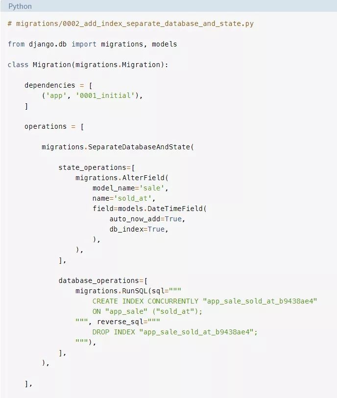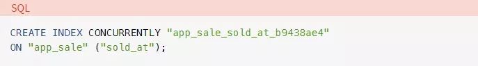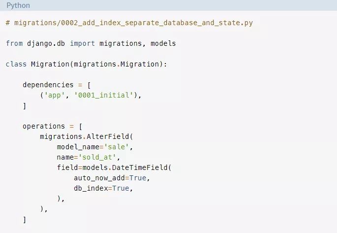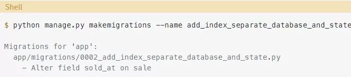 Django在字段sold_at上生成了一个AlterField操作。该操作会创建一个索引并更新状态。我们希望保留这个操作,但是在数据库中提供一个不同的命令来执行。