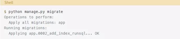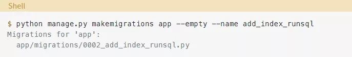 Django提供了一种使用RunSQL在迁移中执行原始SQL的方法。我们来尝试使用它代替直接在数据库中执行命令。