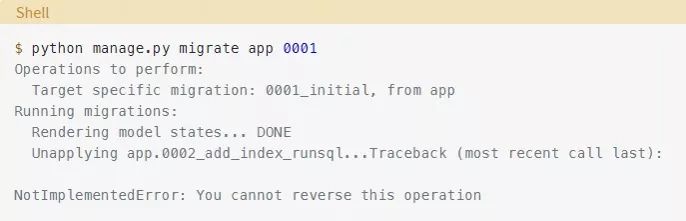 要进行一次逆向迁移,Django会对每个操作执行相反的操作。在本例中,添加索引的反面是删除索引。正如你已经看到的,当一个迁移是可逆的时,你可以取消应用它。就像你可以在Git中使用checkout一样,如果你对较早的迁移执行了migrate命令,你可以进行逆向迁移。