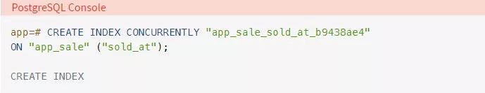 你希望在不锁定表的情况下创建索引,因此你需要修改命令。添加CONCURRENTLY关键字并在数据库中执行: