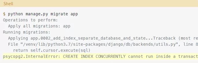 在生成迁移时,Django不会使用这些特殊的关键字。按原样运行迁移将使数据库获得表上的独占锁,并在创建索引时防止DML操作。