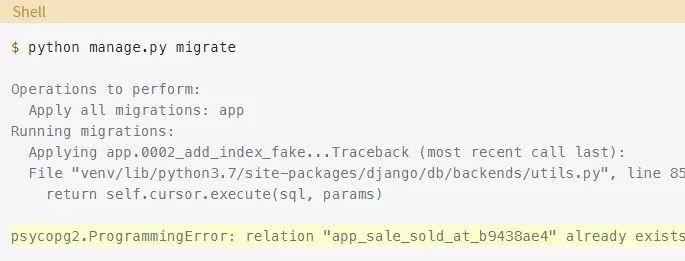 Django会提示你该索引已经存在,因此无法继续迁移。你刚刚在数据库中直接创建了索引,所以现在需要让Django认为已经应用了迁移。