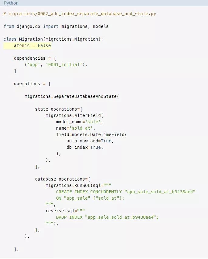 为了能够在迁移中并发地创建索引,你需要告诉Django不要在数据库事务中执行迁移。为此,通过将atomic设置为False,将迁移标记为;非原子(non-atomic):