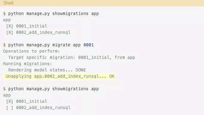 我们对第二次迁移进行了反转,Django删除了索引。现在可以安全地删除迁移文件了: