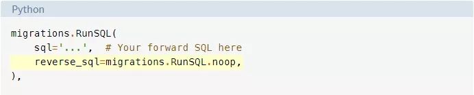提供reverse_sql总是一个好主意。在反转原始SQL操作而不需要其他任何操作的情况下,你可以使用特殊的哨兵语句migrations.RunSQL.noop将该操作标记为可逆操作。
