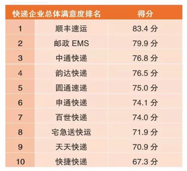 测试结果显示,快递企业总体满意度排名和得分依次为:顺丰速运(83.4分)、邮政EMS(79.9分)、中通快递(76.8分)、韵达快递(76.5分)、圆通速递(75.0分)、申通快递(74.1分)、百世快递(74.0分)、宅急送快运(71.9分)、天天快递(70.9分)和快捷快递(67.3分)。其中,韵达快递和百世快递总体满意度上升较为明显。