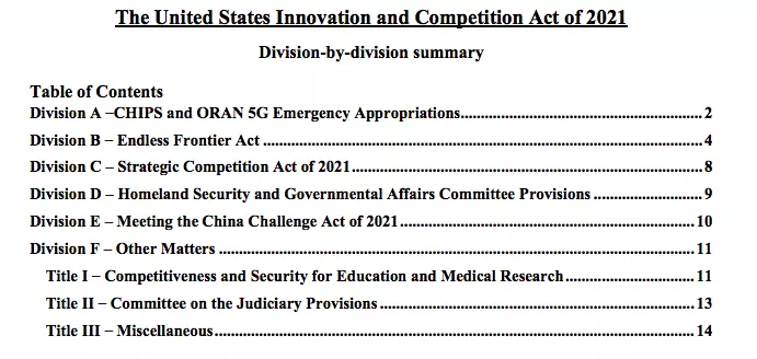 2021年6月8日,美国参议院以68票赞成、32票反对,压倒性通过了长达1400多页《2021美国创新与竞争法案》。