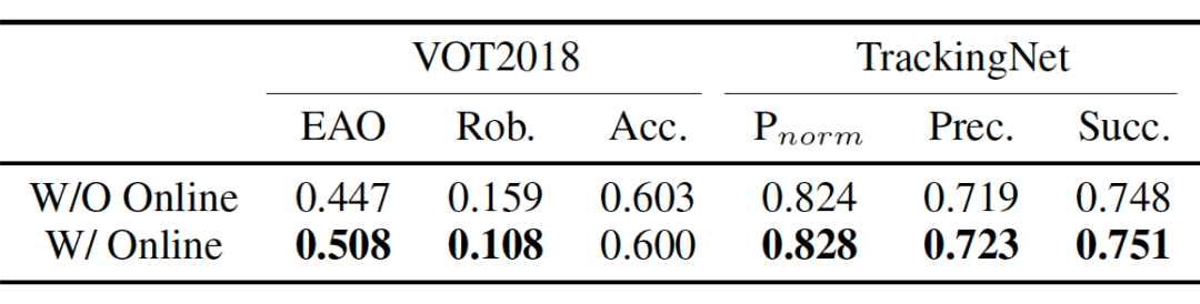 从 VOT2018 和 trackingnet 可以明显的看出回归分支在线训练的作用,而 VOT 的 accuracy 这个指标之所以比不用在线训练低,是和 vot 的测试方式有关的。在 vot 数据集的测试过程中,如果跟丢了目标就会计作 lost 一次,重新给定目标的真实框进行跟踪。