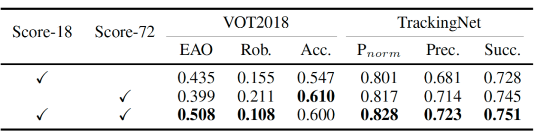 为了保证分类分支定位目标中心点的精度,我们生成了大小为 72 的分类 score map,然后发现 score map-72 对于相似目标的判定效果不是好,而大小为 18 的低分辨率 score map,虽然精度没有 score map-72 高,但是鲁棒性更好一些。因此我们将两个不同 scale 的 score map 融合进行预测,下面的消融实验也会详细验证。