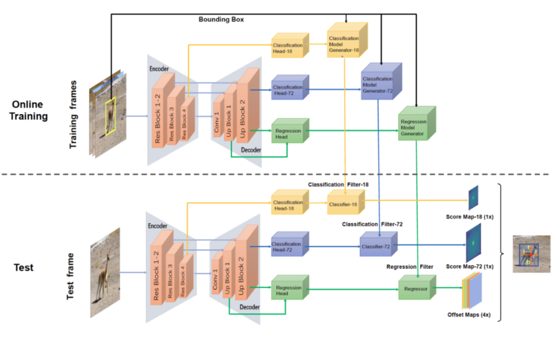 该网络的上半部分为在线训练部分,用来通过训练帧(给定的第一帧以及以及跟踪结束的之前帧)产生分类 model 和回归 model(即卷积核),下半部分为测试部分,通过上面产生的 model 来对当前的测试帧进行分类和回归,得到目标的中心点和中心点到四个边界的偏移,从而产生最终的目标框。