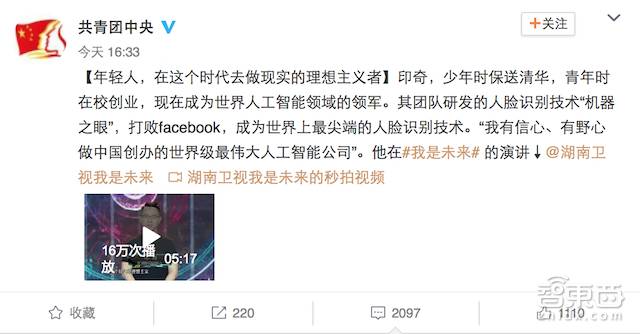 而在8月15日,共青团中央的官方微博更是专门发了一条原创微博,介绍了旷视科技(Face++)创始人兼CEO印奇的经历,并附上了他在《我是未来》节目中一段五分钟的演讲视频。