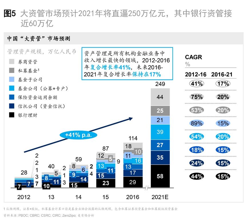 同时,中国的资产管理行业正处于快速成长期,据普华永道的调查和预测,中国总体资产管理规模增速将会超过发达国家,大资管市场预计2021年将直逼250万亿元,从而形成资管行业的新资产池。